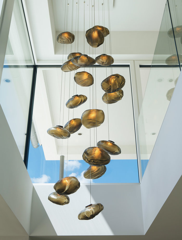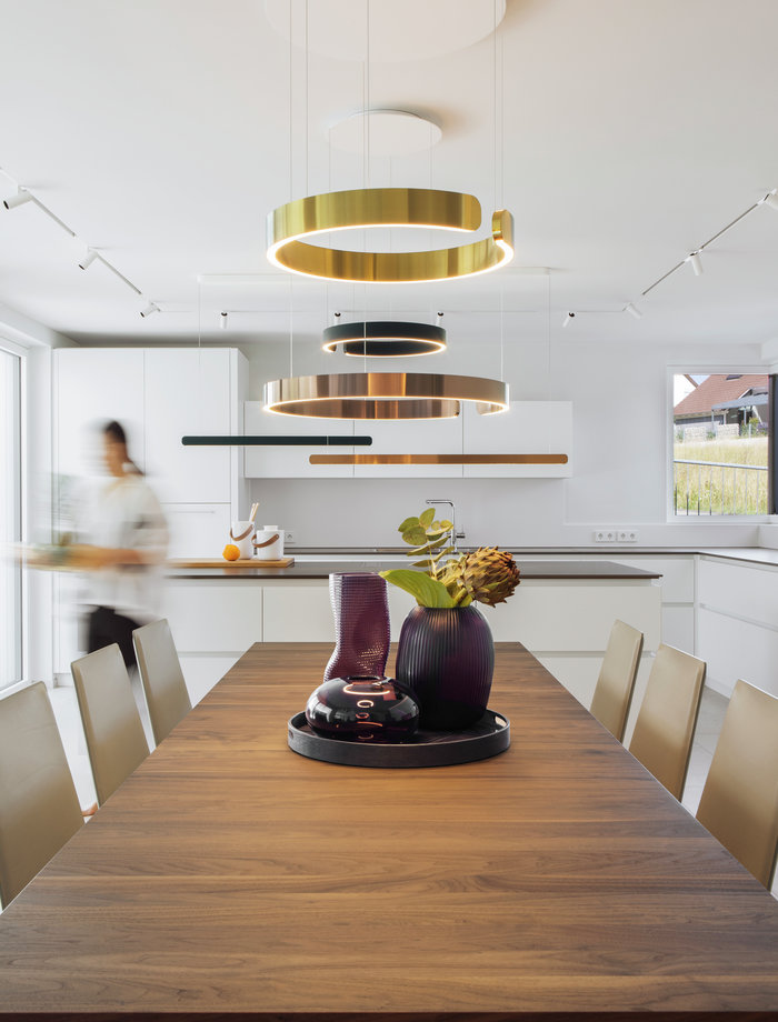 Das architare Team wurde auch mit der Lichtplanung des Neubaus beauftragt. Die für die Räume ausgewählten Leuchten unterstreichen den Stil der Bewohner und harmonieren perfekt mit der Inneneinrichtung. Für die Grundbeleuchtung des Hauses und des Außenbereichs schlug architare die modernen Highend-Lichtsysteme von Artemide vor. In Küche, Wohn- und Essbe- reich entsteht mit der Leuchtenserie Mito von Occhio ein stimmiges und ein- heitliches Lichtkonzept. Die indirekte, farblich steuerbare Beleuchtung lässt die Bewohner die Räume in verschiedenen Stimmungen erleben. Highlights setzten zudem die Leuchten von Bocci: Die Lichtskulpturen des kanadi- schen Unternehmens werden in der eigenen Glasmanufaktur manuell gefertigt. Dabei entstehen wahre Kunstwerke wie die grandiose Pendelleuchte Nr. 73 im Luftraum des Hauses. Sie besteht aus 20 Einzelleuchten und resultiert aus einem aufwendigen Herstellungsprozess, bei dem flüssiges Glas in ein gefaltetes, hitzeresistentes Gefäß aus Keramikgewebe eingeblasen wird. Die fantastischen Lichtspiele der Bocci Leuchten wiederholen sich in Ankleide und Schlafzimmer. Das warme Licht sorgt hier für eine behagliche Atmosphäre.
