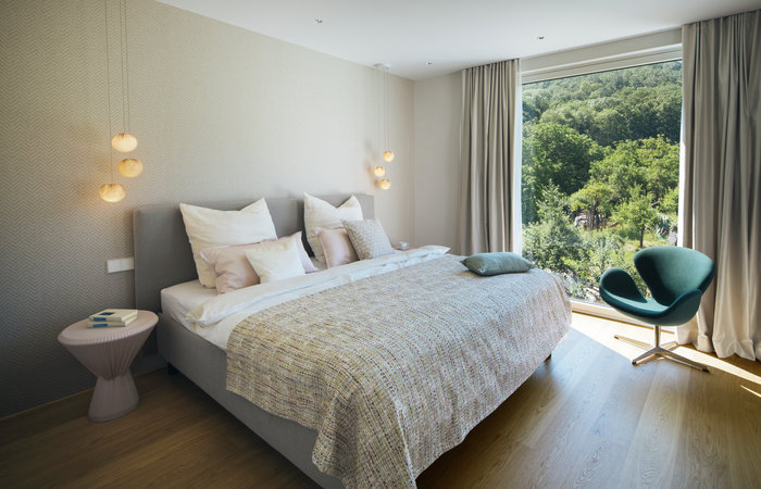 Lieblingsfarbe Rosa, Antiquitäten, Weinkeller & Spa: Die Einrichtung bringt die individuellen Vorlieben der Bewohner zum Ausdruck Ein wichtiges Anliegen der heutigen Bewohner der Villa im Zabergäu war es, ihre Erbstücke und Antiquitäten in das Einrichtungskonzept zu integrieren. Die Charakterstücke bekommen heute in den von architare gestalteten Räume genau die Aufmerksamkeit, die sie verdienen – und das auf ganz selbstverständliche Weise. Auch Rosa – die Lieblingsfarbe der Hausherrin – fügt sich charmant ins Ambiente ein: Mit dem rosafarbenen Samtbezug der Bao-Sessel im Wohnzimmer, den Porzellantischchen von Fürstenberg im Schlafzimmer oder den Deko-Kissen auf Sofa und Betten. Neben der Möblierung der Wohn- und Schlafräume realisierte architare auch die Einrichtung des Spas und des Weinkellers im Gartengeschoss der Villa Den Weinkeller interpretierte das architare Team mit einen Wandpaneel von Tecnografica und dem Kronleuchter Coppélia von Moooi modern und zeitgemäß. Der Tobu Wood Table von Walter Knoll und die klassischen Kaffeehaus-Stühle von Thonet runden das Ambiente ab.