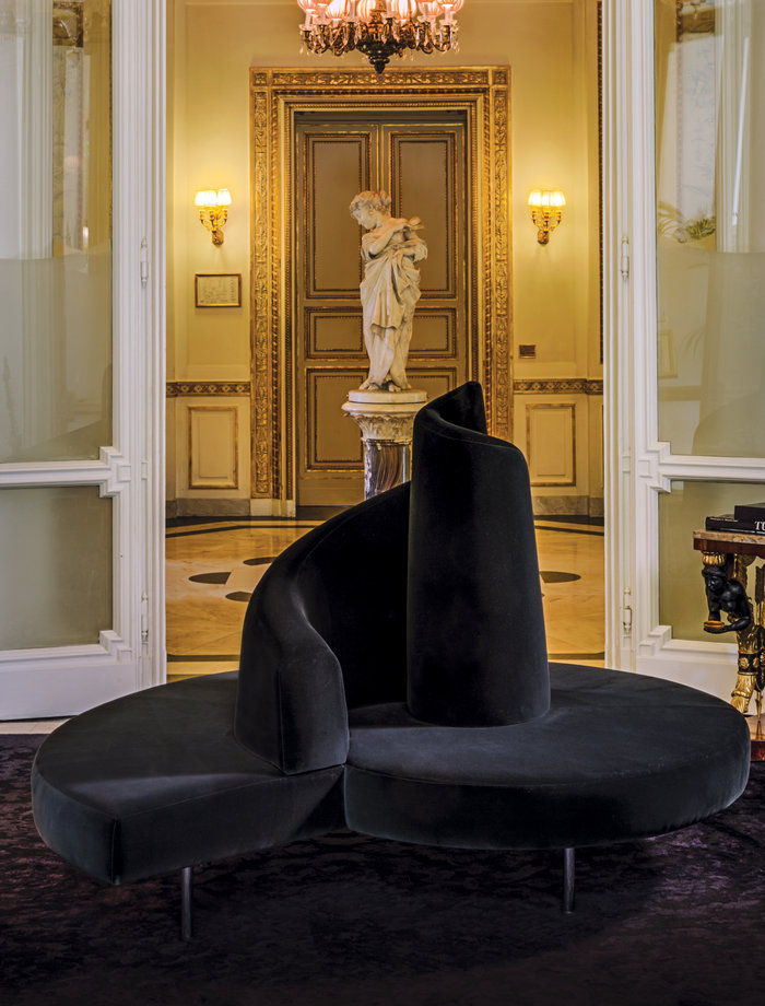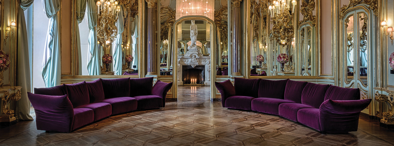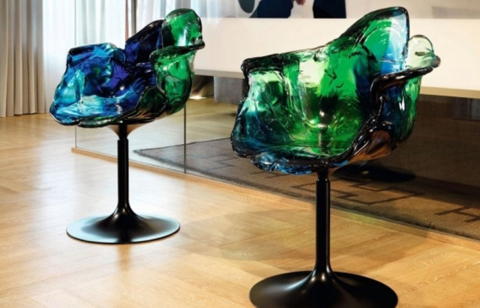 Die Geschwister Valerio und Monica Mazzei hatten von Anfang an das Besondere im Blick: exklusive Exotik made in Italy. Sie setzten auf das Einzelstück, den Blickfang, dem sie immer einen Dreh mitgaben. Wer sonst (außer vielleicht Philippe Starck oder den Brüdern Campana, die übrigens für Edra arbeiten) hätte ein Spaghetti-Knäuel aus Kunststoff zu einem Stuhl verarbeitet? Der Stuhl „Gina“ aus transluzentem Polycarbonat und schwarzen Holzfüßen stellt sich nicht einfach in die Reihe oder an eine Tafel, er möchte selbst glänzen. Designer Jacopo Foggini gab dem Formlosen Gestalt und spendierte uns einen überraschend bequemen Stuhl. Ähnlich exotisch kommt auch „Ella“ daher, eine amorphe Antwort auf die Experimente der Fünfziger- und Sechzigerjahre. Waren es damals Sitzschalen aus weißem Kunststoff, so sind es nun grünblau schimmernde Polycarbonate, die sich wie unregelmäßige Blüten öffnen. Die Form wird per Hand nachbearbeitet. sodass die Serie mit der Idee des Unikats spielt. Auch „Ella“ stammt von Jacopo Foggini, der einen soliden Fuß aus Metall wählte, um dem Sitzobjekt den nötigen Stand zu verleihen. Bekannt geworden ist Edra allerdings durch zwei Entwürfe, die inzwischen so ikonisch wirken, als wären sie wesentlich älter (was für die Firmenstrategie spricht): „Tatlin“ von Canzani und Semprini sowie „Getsuen“ von Masanori Umeda. Das eine, ein Blickfang-Sofa von beachtlichen Ausmaßen, angelehnt an den revolutionären Entwurf von Wladimir Jewgrafowitsch Tatlin für die Dritte Internationale (entworfen 1919), zeigt mit der sich schneckenartig nach oben verjüngenden Sitzspirale eine gezähmte Version der nie gebauten Architekturikone, auf der sich gut und gerne acht bis zehn Besucher tummeln können. Ihr roter Bezug ist als augenzwinkernde Hommage an die sozialistische Idee zu verstehen, ganz anders bei „Getsuen“, einem Blütensessel aus rotem Samt, der sich für seine Besitzer öffnet. Form und Farbe verschmelzen hier zu einer Einheit und führen oft dazu, dass man sich im Sessel ausgiebig aalt.