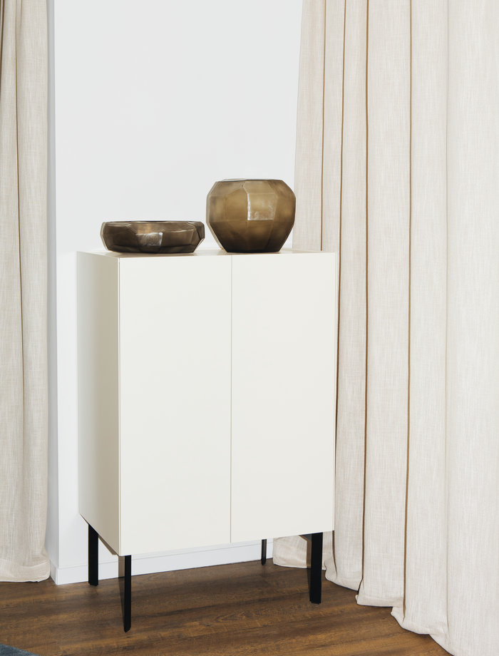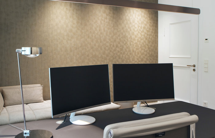 Das Arbeitszimmer: Fokus auf Effizienz Im Arbeitszimmer setzt sich das minimalistische Farbschema fort. Der Raum wurde bewusst schlicht gestaltet, um den Fokus auf das Arbeiten zu legen. Dennoch ist das Ambiente weit entfernt von einer nüchternen Office-Atmosphäre. Ein wesentlicher Beitrag zu diesem einladenden Ambiente haben zweifellos das komfortable Daybed von Schramm und die eleganten Vorhänge. Trotz eines einzigen Fensters erstrecken sich die Gardinen über die gesamte Wand und fungieren wie eine Art Weichzeichner.