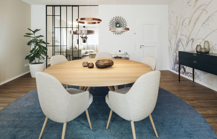 Objekt: Vier-Zimmer-Altbauwohnung im Raum Stuttgart | Aufgabe: Inneneinrichtungs- und Möblierungskonzept, Erweiterung eines Durchgangs zwischen Wohn- und Essbereich, Vorhänge, Tapeten, Teppiche, Vasen, Übertöpfe, Leuchten, Farb- und Materialgestaltung, Lieferung und Montage