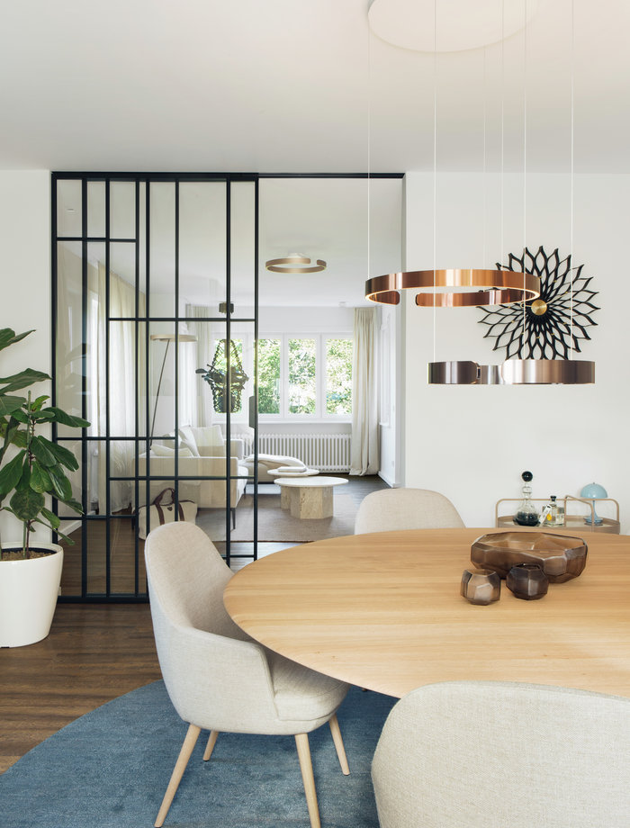 Umbaumaßnahmen für mehr Licht und Großzügigkeit Projektleiterin Katharina Pfeiffer schlug vor, den schmalen Durchgang zwischen Wohn- und Essbereich zu vergrößern, um mehr Licht und Großzügigkeit zu schaffen. Diese anspruchsvolle Umgestaltung führte unter der Leitung von architare ein erfahrener Trockenbauer durch. Highlight des Umbaus ist die maßgefertigte Schiebetür von Rimadesio, die beide Bereiche miteinander verbindet. Das Ergebnis: Wohn- und Esszimmer wirken heute heller, großzügiger und präsentieren sich dank der Tür im Industrial Style in einem leichten und modernen Loft-Look.