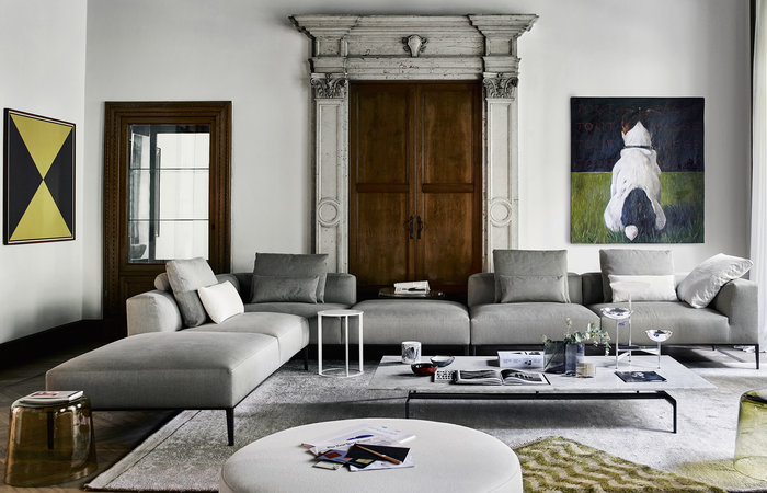 Das Wohnzimmer – die Seele des Hauses Das Wohnzimmer ist das Herz des Hauses – ein Ort zum Entspannen, Lesen, Fernsehen und erfreulicherweise auch wieder mehr und mehr ein Ort zum Reden und Diskutieren. Glaubt man Trendforschern, dann ist die Zeit des reinen „Cocoonings“ vorbei und wir sehnen uns wieder mehr nach Gesellschaft, guten Gesprächen und Geborgenheit. „Big Sofas“ wie z. B. Michelle Effe von B&B Italia, die durch Module individualisierbar sind, bleiben daher Mittelpunkt des Wohnzimmers. Begleitet werden die eleganten Sitzlandschaften von Sesseln, Couchtischen und einer ausreichenden Armada an Sidetables zum Abstellen von Weingläsern oder Tassen.