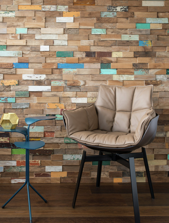 Besonders beliebt bei den Bewohnern ist das Redondo Sofa von Moroso, dessen samtigweicher Stoff bezug mit den türkisfarbenen Holzschindeln der Wohnzimmerwand korrespondiert. Auch die Husk-Stühle von B & B Italia vereinen modernen Komfort mit individuellem Design.