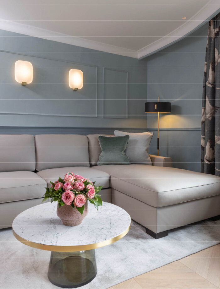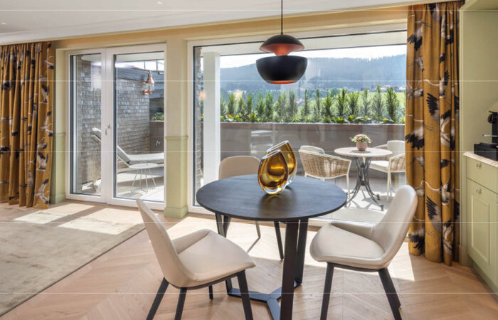 In den neuen Suiten wurde sowohl auf maßgefertigte Schreinerinnenausbauten gesetzt als auch auf Farb- und Materialkonzepte, die die Natur in den Raum holen: Pastelliges Grün, Blau und Rosa, Beige- und Brauntöne, aber auch Akzente in Gelb und Schwarz. Von Bergen, Wiesen und Seen über Sonnenauf- und -untergänge bis hin zu nächtlichen Momentaufnahmen finden sich großflächig oder im Details Referenzen auf das direkte Umfeld. Vorbild für die Materialverwendung steht ebenfalls die Natur. So vereint zum Beispiel der skulpturale Tisch „Temno“ von Walter Knoll, ein Unternehmen, das ebenfalls in der Region produziert, zwei natür- liche Materialien: Die Tischplatte ist aus Massivholz, der Fuß aus samtig-mattem Manufakturbeton. Im Kontrast zu den Holzleisten und Stuckelementen an Wand und Decke stehen die weichen, runden Formen von Sesseln und Beistelltischen wie den Bell Side-Modellen von Sebastian Herkner für ClassiCon und die Stücke der „Uves“-Kollektion von Andreu World. Manche der verschiedentlich eingerichteten Suiten runden den Einsatz geometrischer Formen und Naturreferenzen glänzend mit den Leuchten „Here Comes the Sun“ von DCW éditions ab.
