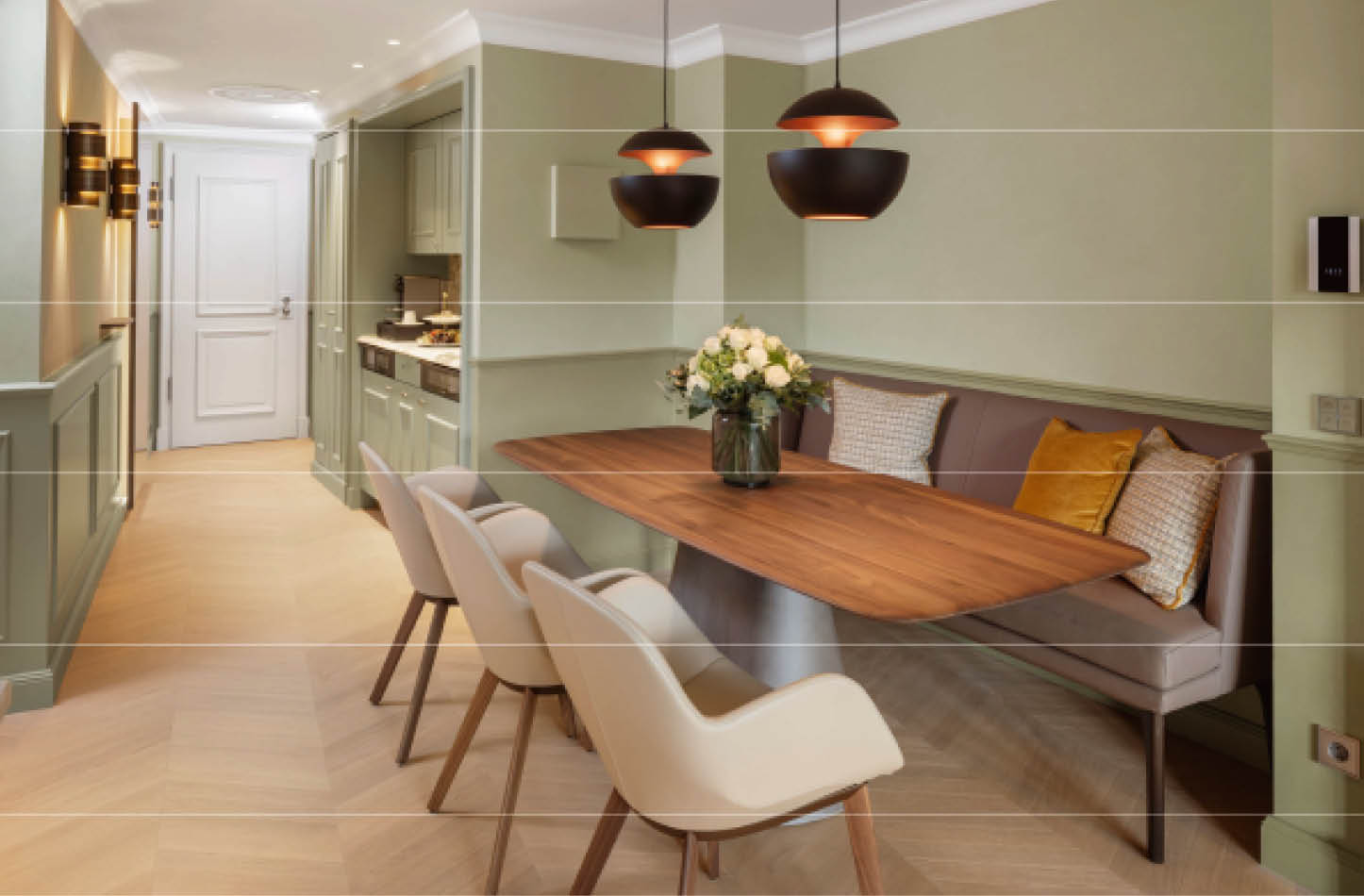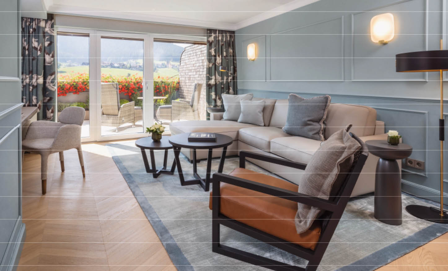 3 Michelin Keys fürs Hotel, 3 Michelin-Sterne für das Restaurant Bareiss erkocht von 3 Sternekoch Claus-Peter Lumpp – wer im Hotel Bareiss eincheckt, erwartet und bekommt Hotellerie und Gastronomie auf höchstem Niveau. Zahlreiche (Stamm-)Gäste reisen in Gesellschaft an. Und bleiben. So stieg die Nachfrage nach Räumen für Familien, Mehrgenerationenurlauber oder Freundeskreise. Folg- lich wich die Penthouse-Etage einer neuen Suiten-Etage. Die Herausforderung für die Entwicklung dieser Gästezimmer, in denen sich Menschen Gäste jeden Alters für eine längere Zeit aufhalten und wie zuhause fühlen sollen, sind besonders. „Möbel müssen funktional, hochwertig, robust und langlebig sein, gleichzeitig aber auch einen Charakter haben“, so Peter Hauber und ergänzt „zudem ist die hohe Aufenthaltsqualität auf kleinem Raum entscheidend. Die große Kunst ist es, die Räumlichkeiten so einzurichten, dass sich normale Tagesabläufe im Umfeld eines 5-Sterne-Hotels subtil verbinden.“ Sprich: Die Suiten-Interieur balanciert auf einem schmalen Grat zwischen heimeligem Wohlgefühl und luxuriösem Hotelambiente.